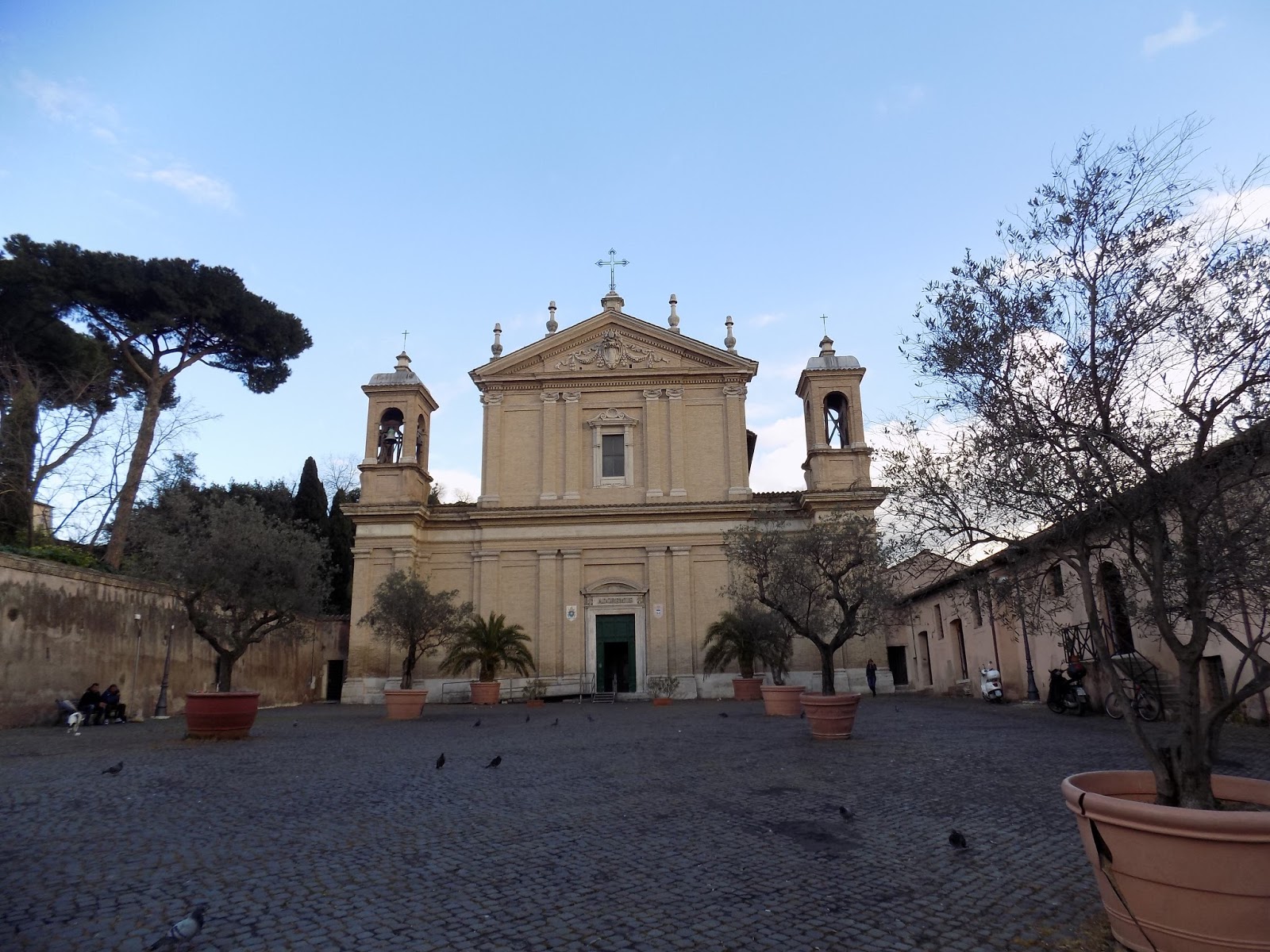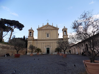 The current church was completed in 1650 by Cardinal Mazarin, and has a fairly distinctive facade because nobody imitated it -- the Romans made fun of it and called it The Canebrake. The church is most famous because it has all the hearts of the popes from Sixtus V to Leo XIII; which, you must admit, is a very unique kind of collection. The building to the left of the church is the Palazzo Castellani; if it weren't in the way, I could have given you a picture of the Quirinal Palace, for which it was once the parish church.