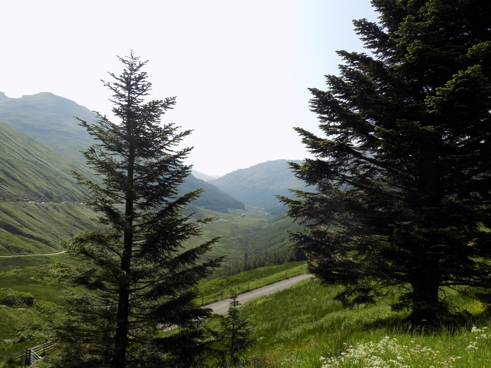 From Tarbet we headed mostly westward to Glen Croe, which has a famous viewpoint, Rest and Be Thankful. Due to the Jacobite rebellions, the English realized that they needed a better road system to move troops around on, so they sent General Wade to start laying down military roads, and quite a few Scottish roads today had their first beginnings with Wade's roads. But Highland geography can be a bit challenging, so exhausted soldiers were glad to have a place to stop, and that, it is said is the origin of the name. It overlooks the Drover's Road laid down by Wade's men: